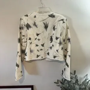 The Cameron Sequin Jacket is a crew neck style with a slightly boxy silhouette and embroidered tweed. It features a custom print developed in-house for a shadowy floral effect in a technique using real flowers