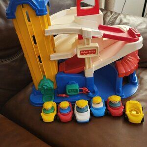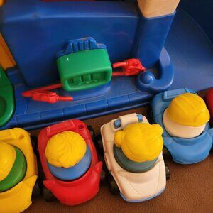Vintage Fisher Price 1995 Little People Parking Garage with Elevator, cars and people. 6 cars and 5 people.