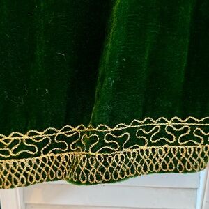 Beautiful long sleeve green velvet dress with gold details. Ideal for events. My mother entertained wearing this dress in the 1970’s. It’s been in the closet for decades untouched. Very good condition. Size Large. Fits size 10-12. Measurement from top of collar to bottom back of dress is 5ft. Throwing in Matching shoes for free since they need some repair/love