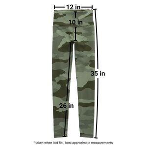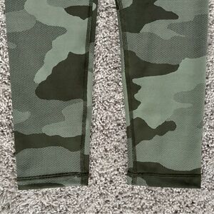 Camouflage activewear leggings. High waisted, 7/8 length. Lightly textured fabric. Moderate-to-high stretch, medium compression, made for movement. Thicker, mid-weight material.