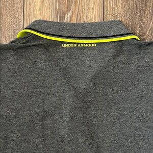 Stylish Under Armour polo shirt. Features a sleek gray color with vibrant yellow accents. Perfect for casual or sporty occasions.
