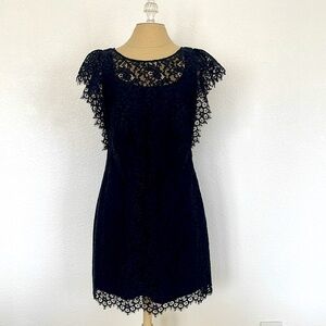 Stunning lace mini dress by Phoebe Couture. With fluttering cap sleeves and an exposed zipper on back, this cocktail dress . Subtly romantic, with a sweet, scalloped lace overlay. Cap sleeves. Scalloped hem. Exposed back zip. Fully lined. Boat neckline. Allover lace mini dress Color: Black