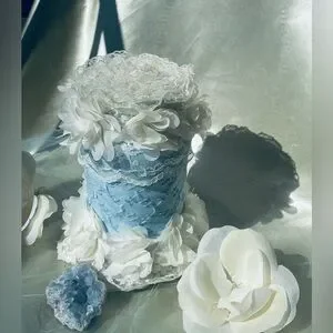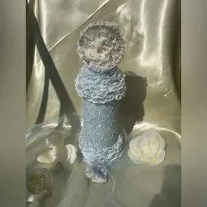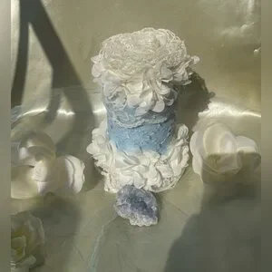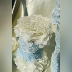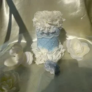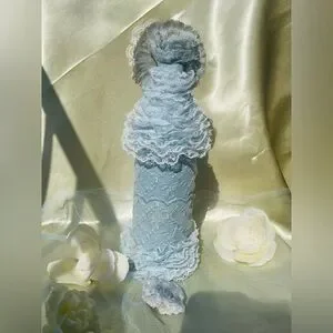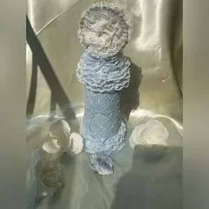 Upcycled glass bottle with pearly, powder blue paint (nontoxic) with an overlay that’s powder blue with floral embroidery; embellished with powder blue lace around the neck section as well as the bottom section; crowning the top section is a floral design of creamy lace, powder blue silk accented with champagne glitter paint (nontoxic). The bottle’s dimensions are the following: Approximately 4 inches wide; about 12 inches tall.