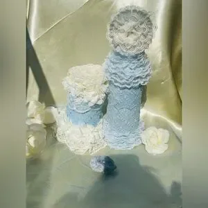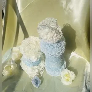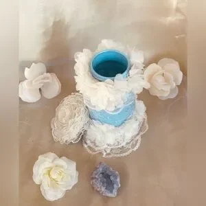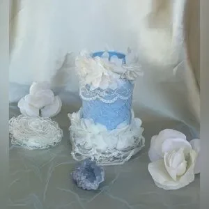 Upcycled glass jar with pearly, powder blue aint(nontoxic) with an overlay that’s powder blue with floral embroidery; the lid is adorned with floral design of creamy lace; embellishments of creamy lace and creamy silk floral trimmings in both the neck section and the base section.