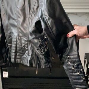 Stylish black faux leather moto jacket by GUESS. Features gold zipper accents. Perfect for a chic look.