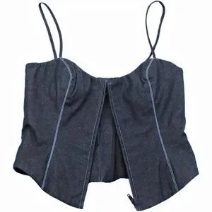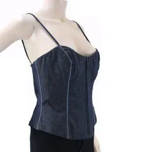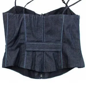 Vintage Y2K denim cropped corset top from designer duo, All About Eve. Purchased in 1999, from their debut collection in Germany and worn only once this "couture" corset is in excellent condition. Details like the authentic corset stays, double top stitched accents and push up inserts make this Handmade in Germany piece near couture. A perfect piece for layering under an evening jacket.