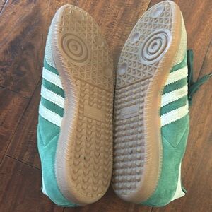 EUC. These shoes are like new. No box. The popular adidas Samba in green leather with white stripes and heel tabs. Men's size: 11.5