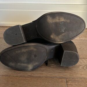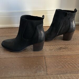 Black booties. Good condition. Side zipper. Approx 2.75” heel height. Approx 5” shaft. Leather with fabric inset.