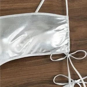 Brand New Dazzling silver one-piece swimsuit. Features a unique cut-out design. Perfect for beach or poolside glamour. SZ L