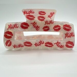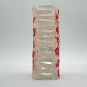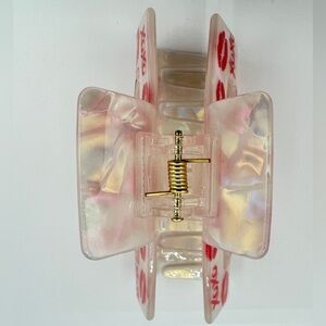 Pretty white pearlized hair clip with iridescent colors throughout. Fun red lip and XOXO print covers the clip’s exterior. New; 3.25”.