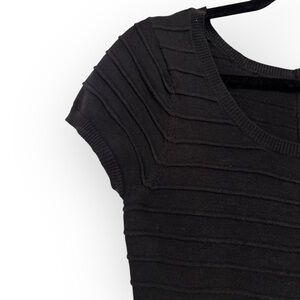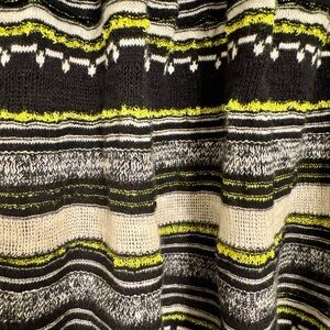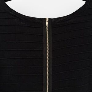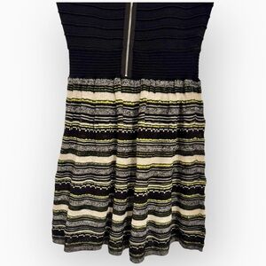 Black and green Sandro mini dress with scoop neck, varying textured knit, inset waist and exposed metal back zip closure.