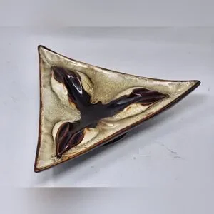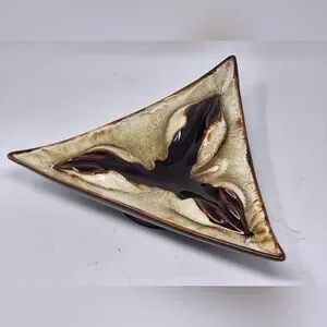 Vintage Ceramic Triangle Shaped Ashtray With Two Toned Brown Glaze. This Vintage Ceramic Ashtray Is Stamped On The Bottom Rim USA. Peice Is In Good Used Vintage Condition Showing No Chips Cracks Or Damage To Note.