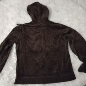 Women's large sized brown velour hooded sweater jacket. Drawstrings in hood. Zippered front closure. Rhinestone metal accents (some rhinestones missing in zipper pull). Material: 80% cotton; 20% polyester. Measurements are approx.: chest- 22½"; sleeves- 23"; total length- 23". See photos. Ask if you have questions. Thanks for stopping by!