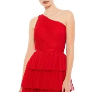 NWT Ieena for Mac Duggal A-Line Tiered Ruffle One Shoulder Sleeveless Gown Swiss Dot Tiered Tulle Maxi Dress size 6, color red