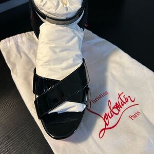Black patent leather sandals from Christian Louboutin. The Supramariza sandals are made of patent leather with a slightly rounded open toe along with an adjustable buckle closure. It features criss-cross straps at the toe, set on a 130mm block heel.