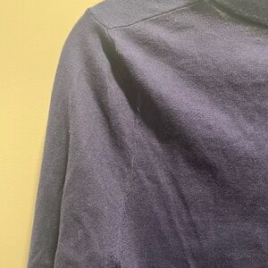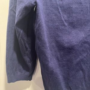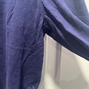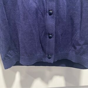 This elegant Kate Spade cardigan in size large features a timeless navy blue color with matching blue buttons for a polished look. Adding a signature touch of charm, a bow detail graces the back, making this piece uniquely feminine. The lightweight fabric, crew neckline, and 3/4 sleeves make it a versatile layering option for both casual and formal occasions.