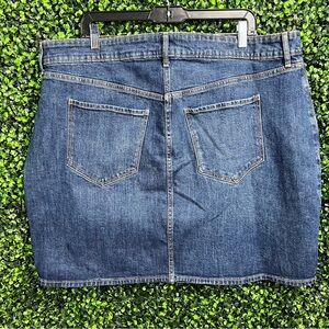 NWT. Knee-length denim skirt in a classic blue wash, featuring a button-up front closure and a standard waistband. Secret slimming feature. Smoke/pet free.