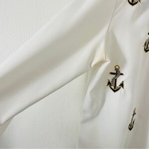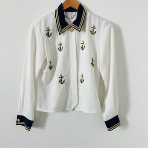Size 4P from petite sophisticate - an incredible vintage nautical blouse with embroidered anchors and sleeve details. Collared. Please note the underarm stains, pictured