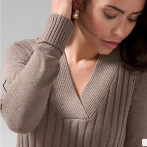 Design details give this long sleeve ribbed tunic its fresh, modern style and cozy, luxurious feel. Made with soft knit fabric that contains a whisper of cashmere, it features a V-neck, wide ribbing, high-low hemline, and side slits. Easy style for denim or leggings. Do not hang to avoid stretch.