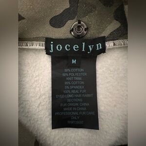 In perfect condition! Amazing Jocelyn camo sweatshirt with detachable rabbit fur hood and pocket accents. Cozy warm in the winter and can detach in the summer!