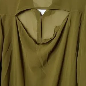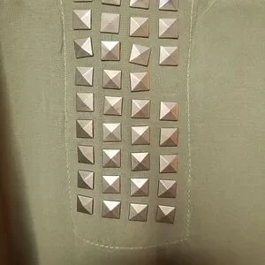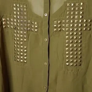 Size Large olive green button down collared missing on stone on front didn't even notice til took pictures see all pictures