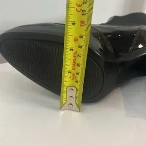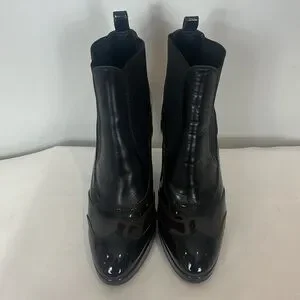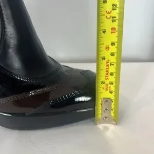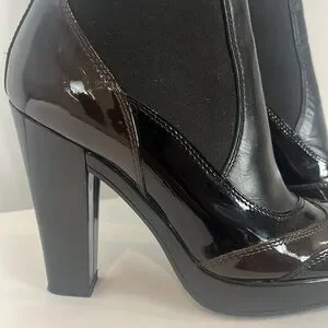 Hogan made in Italy black and chocolate brown patent leather platform boots, booties with black elastic. Heel is 4.25” and platform is 1”. Labelled size 38, equivalent to 7.5 Canadian/US.
