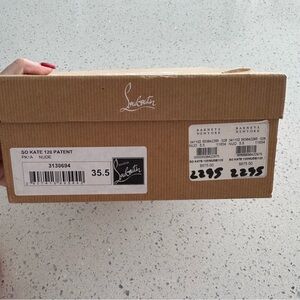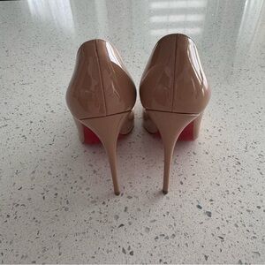 Elegant nude patent leather heels. Signature red soles. Perfect for any occasion.
