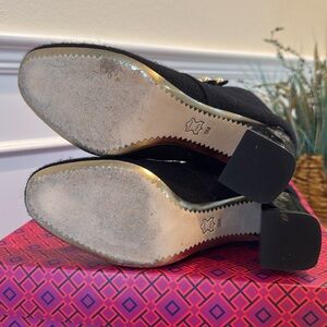 Flannel upper, Elasticized straps with dome-button detail, Side zipper, Leather lining, Leather sole, Approx. 3.35" heel. VERY Hard to Find! RARE! SMOKE FREE HOME! Retail: $498.00.