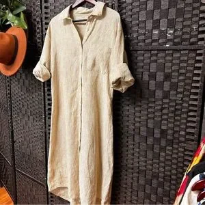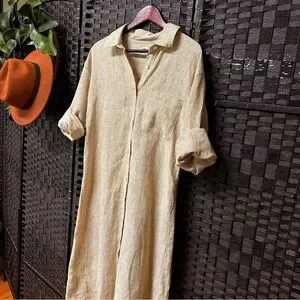 Faherty linen striped duster style midi T-shirt dress size medium khaki white