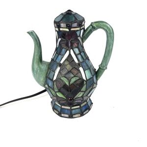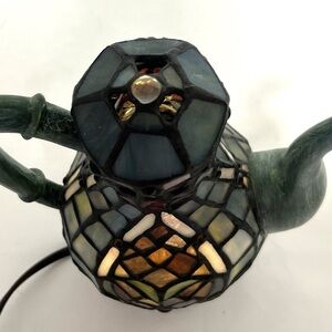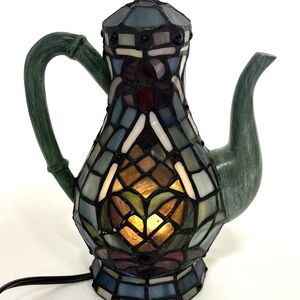 Vintage Tiffany Style Accent Table Lamp Metal and Stained Glass Coffee Pot Lamp 7" x 9" tall