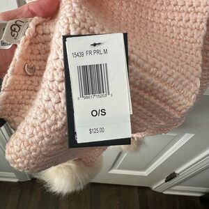 Elegant knit scarf with playful pom poms. Has small sequins threaded throughout. Perfect for adding a touch of style. Very pretty blush color. NWT. Ugg brand.