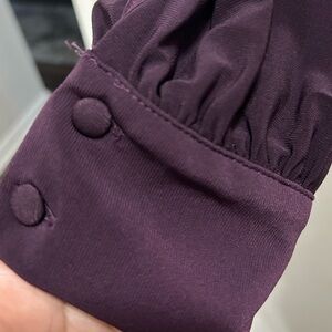 This long sleeve blouse is beautiful with its deep purple color. Fabric covered buttons. Pleated sleeves. Classy tie at the neck dresses it perfectly! Looks great with jeans also!