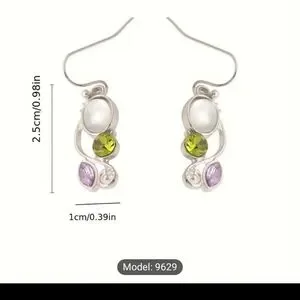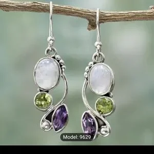 Chic silver earrings with colorful gemstones. Features green, purple, and white stones. Perfect for any occasion. Synthetic moonstone