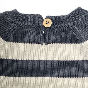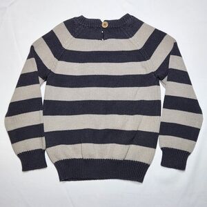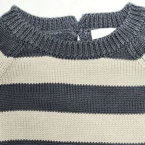 Jamie Kay Striped Crewneck Cotton Sweater with Button Closure. Size 2. Colors are a Dark Grey and Light Grey. This adorable striped sweater is a perfect layering piece it features thick knit cotton, 1 wooden button closure on the back of the sweater, alternating stripes of dark and light grey, and rib knit cuffs and hem. It is in excellent pre-loved condition with no wear to speak of. Please see pictures for more details. Thanks for shopping!