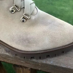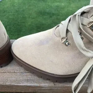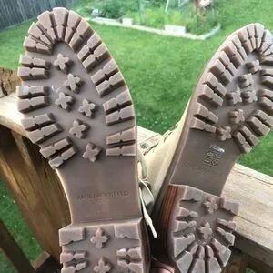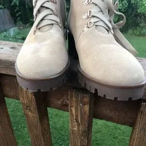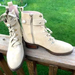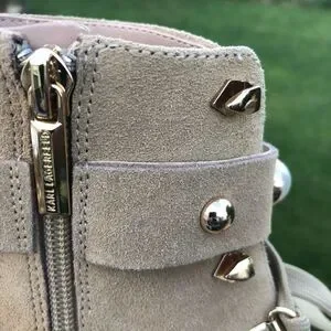 Karl Lagerfeld leather lace up boots have pearl like and gold stud embellishments. Side zip closure and a nice thick sole. Comfy and stylish. Some minor signs of wear but still in good condition. Boot is 9in height with heel, size 10