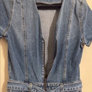 Stylish denim jumpsuit with a front zipper. Features short sleeves and a belted waist. Perfect for casual outings. New with tags. Size 28