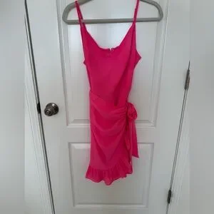 Fit and flare, strappy dress with wrap skirt and hem ruffle.