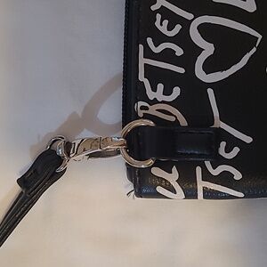No interior pockets, zip closure, lined with cute pink, white, and black Betsey material.