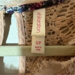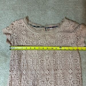 Xhilaration crochet lace front pink lined top in women’s size XS. Top has a top button closure. Front lace is lined and not stretchy. Back material has some stretch. True to size.