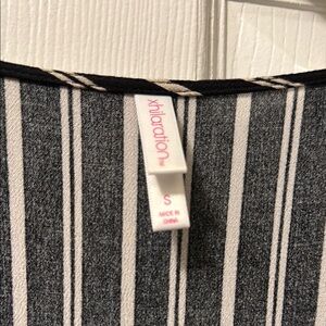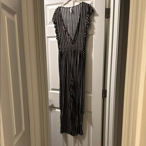 Stylish jumpsuit with vertical stripes and attached tie. Features a deep V-neck and ruffled sleeves. Missing one small button.