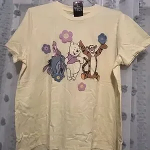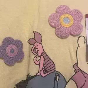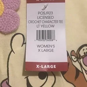 Cute Winnie the Pooh graphic tee. Features Pooh, Tigger, and Eeyore with flowers. Perfect for casual wear. Check out the crocheted details.