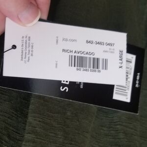 Green ("rich avocado") top with bell sleeves and much of the top third is lace. The non-lace part is 100% rayon, and the lace is 70% cotton, 30% nylon.