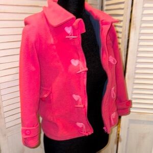 Adorable pink coat with heart accents. Features toggle closures and buttoned sleeves. Ideal for a trendy outfit
