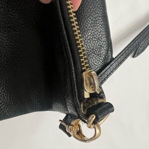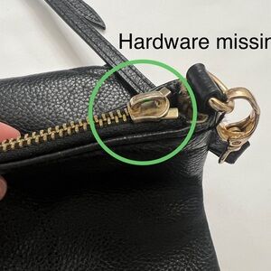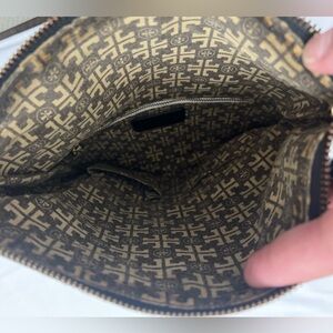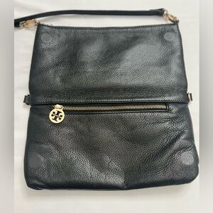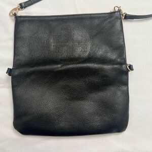The bag features a perforated-logo design and is made of high-quality leather. It has a fold-over style with a magnetic closure and an adjustable crossbody strap.