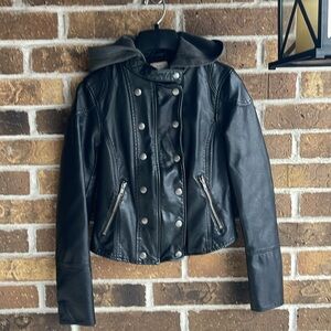 A chic and cruelty-free vegan leather jacket features a removable terry hood, front zipper pockets, and a comfortable lining for perfect style.
