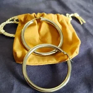 From QVC, heavy hoops perfect for dressing up or down. For pierced ears. Stainless steel hoops with velvet jewelry bag, never worn.