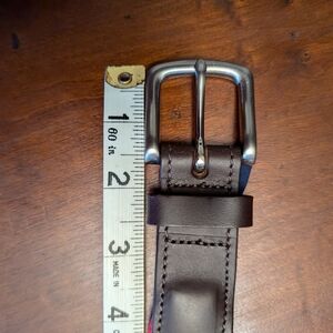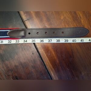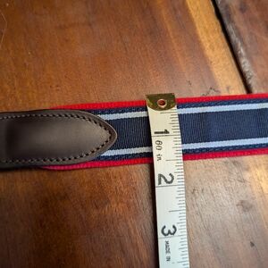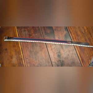Red and blue striped VV belt. Leather accents, solid brass, silver buckle. Men's 36 - additional measurements in photos. Really good condition, no stretching on leather, slight rippling from storage - pictured. Made in the USA. Fast shipping, open to offers