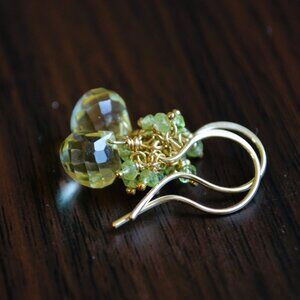 These pale yellow cluster earrings combine the soft shades of Spring in a pretty design. This pair consists of beautifully faceted lemon quartz gemstones topped with a loose cluster of tiny peridot stones. These stones move as you do, and they sparkle in the light. Graceful, gold-filled earwires complete this elegant pair that is perfect for a Spring bride on her wedding day.