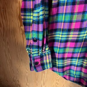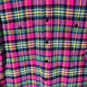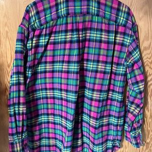Ralph Lauren Vibrant Large Plaid Flannel Long Sleeve shirt with button-up front. Two button pockets on the front. Features a mix of bold colors pink, purple, blue, yellow and lime green. Perfect for casual wear. Excellent used condition. Comes from a non smoking and pet free home.