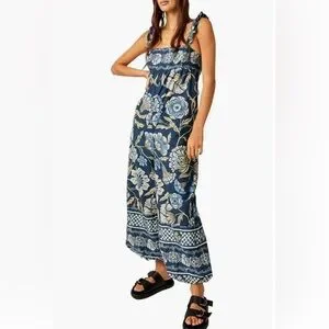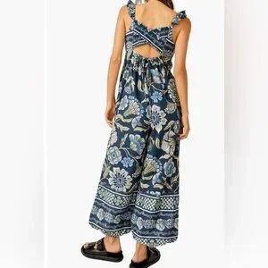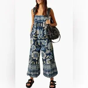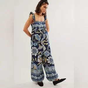 Free People Bali Albright Cotton Floral Jumpsuit With Pockets Blue Combo